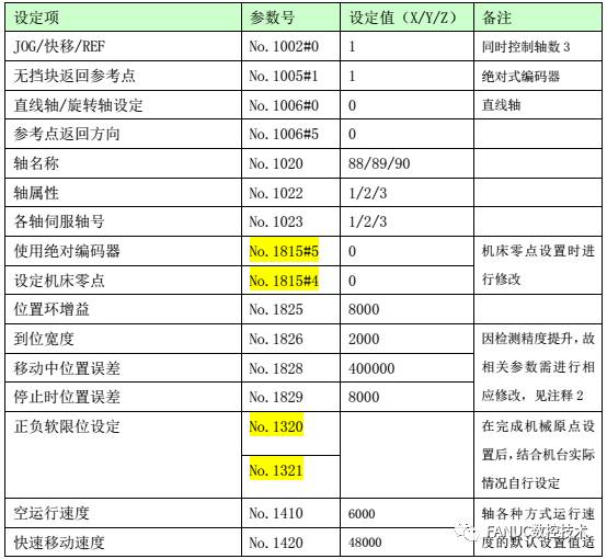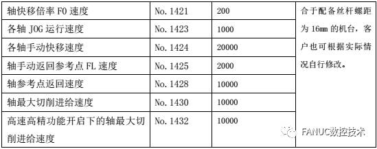 检查相应的轴参数设定是否正确,No.1410-No.1430中移动速度参数的设定,如下表所示:(注:表中数据是钻削中心标准参数,CMR扩大10,仅供参考)