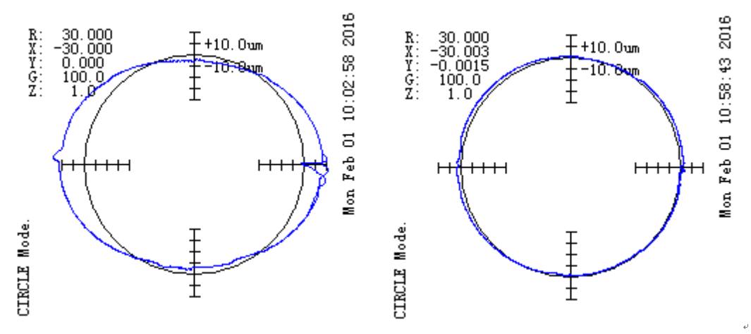 使用ServoGuide对各轴频响曲线、TCMD曲线进行测试,结果均为正常,但X、Y轴机械响应特性存在较明显差异,导致两轴位置环增益、时间常数、前馈能参数一致的情况下,循圆曲线呈椭圆,且X轴换向点过冲。此时通过调整如下参数进行优化:
