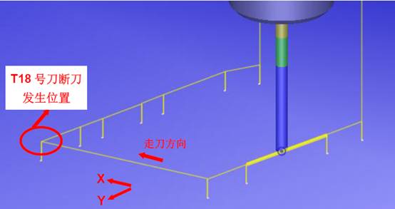 分析认为T18号断刀原因X轴正向G00定位停止时产生过冲,Z轴下刀时,刀具与工件内壁产生干涉,导致断刀。