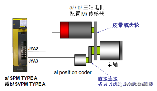 刚性攻丝中需要伺服轴和攻丝主轴之间的位置同步,所以使用电机编码器或外置编码器提供一转信号,常见的配置方案和相关参数设定如下: