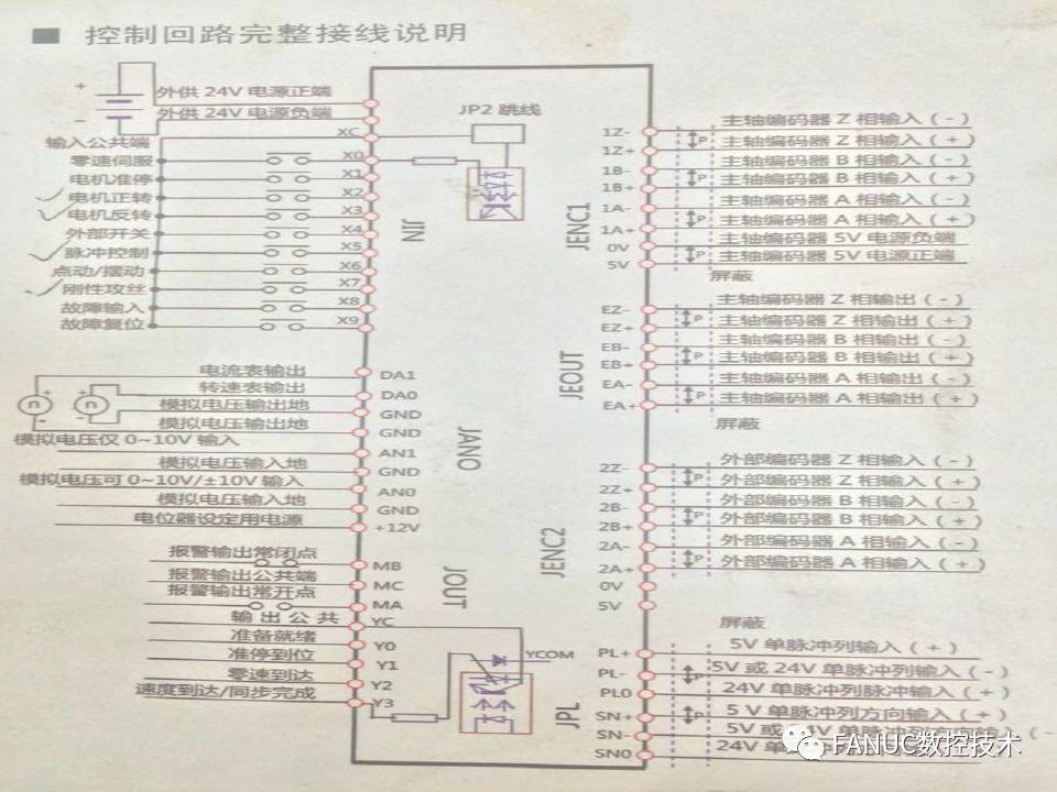 CNC通过JA40的5脚(ES)和7角(SVC)连接主轴变频器端ANO和GND,提供-10-10V的模拟电压,通过JA41连接变频器上的反馈输入JEOUT,得到位置信息。