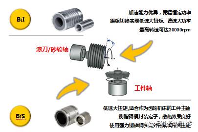 齿轮机中的刀具轴,例如滚齿机、弧齿锥齿轮铣齿机,断续切削方式,所以要求驱动能够做到大输出、低振动。所以这种场合下,使用BiI系列的内装主轴电机最为适合。而工件轴一般要求响应快,大扭矩输出,那么对于小模数齿轮机,一般切削速度会更快,目前干切时,小模数齿轮机工件轴转速能达到上千转甚至更高。因此推荐采用BiS规格电机,它能够很好的满足需求。