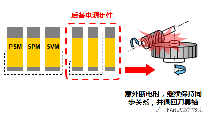 后备电源是一套组件,根据实现的需求不一样,组件里各个模块的选择也不同。如下图所示,其中电容组件储存强弱电能量,控制模块监视电源状况,一旦发生断电,(提前准备后备电源监控断电的三种情况),能迅速通知NC,并触发刀具回退的动作,而电容组件提供回退时的能量,尤其对于齿轮机床,如果此时电子齿轮箱或者柔性同步控制正在使用,那么回退的同时能够继续保持这种同步关系所以无需担心刀具或者工件发生损坏。