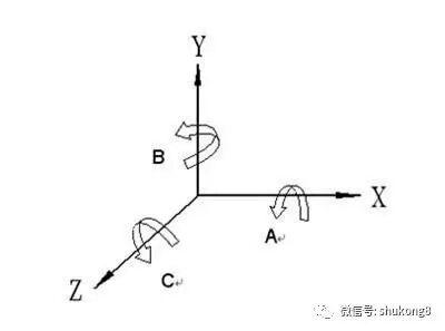 旋转轴的定义也按照右手定则,绕X轴旋转为A轴,绕Y轴旋转为B轴,绕Z轴旋转为C轴。