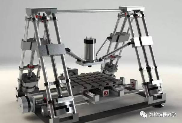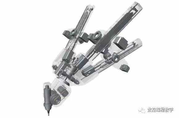 为了解决上述矛盾,在20世纪80年代后,一大批学者开始致力于并联机构的研究,提出了并联机床的概念。并联机床的典型代表是Stewart平台结构,即由六根可伸缩杆和动平台构成,更多数控编程知识关注微信公众号(数控编程教学),可实现较高的动态特性,但工作范围小。为解决这一问题,研究者把并联机构与串联机构结合起来,取得高动态性能和大的工作空间,其典型代表是瑞典的NOUSE公司的Tricepts机床。