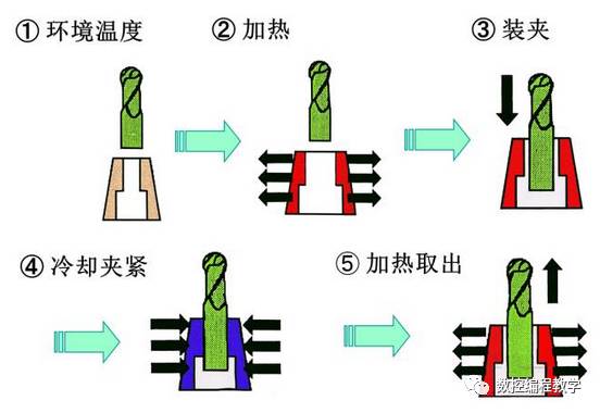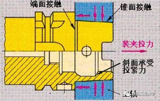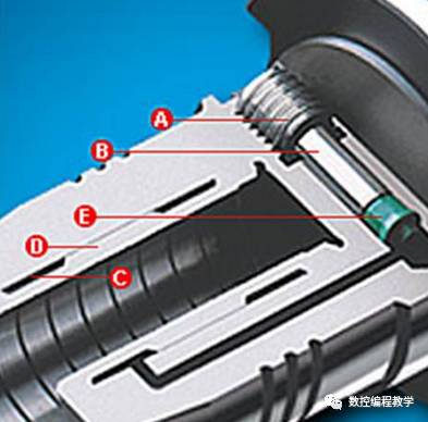 7:24指的是刀柄锥度为7:24,为单独的锥面定位,锥柄较长。锥体表面同时要起两个重要作用,即刀柄相对于主轴的精确定位以及实现刀柄夹紧。 优点:不自锁,可以实现快速装卸刀具;制造刀柄只要将锥角加工到高精度即可保证连接的精度,所以刀柄成本相对较低。 缺点:在高速旋转时主轴前端锥孔会发生膨胀,膨胀量的大小随着旋转半径与转速的增大而增大,锥度连接刚度会降低,更多数控编程知识关注微信公众号(数控编程教学),在拉杆拉力的作用下,刀柄的轴向位移也会发生改变。每次换刀后刀柄的径向尺寸都会发生改变,存在着重复定位精度不稳定的问题。 锥度为7:24的通用刀柄通常有五种标准和规格: 1. 国际标准 IS0 7388/1 (简称IV或IT) 2. 日本标准 MAS BT(简称BT) 3. 德国标准 DIN 2080型(简称 NT或ST) 4. 美国标准 ANSI/ASME(简称CAT) 5. DIN 69871 型(简称JT、DIN、DAT或者DV) 拉紧方式: NT型刀柄是在传统型机床上通过拉杆将刀柄拉紧,国内也称为ST;其它四种刀柄均是在加工中心上通过刀柄尾部的拉钉将刀柄拉紧。 通用性: 1)目前国内使用最多的是DIN 69871型(即JT)和日本MAS BT 型两种刀柄; 2)DIN 69871型的刀柄还可以安装在ANSI/ASME主轴锥孔的机床上; 3)国际标准IS0 7388/1型的刀柄还可以安装在DIN 69871型、ANSI/ASME主轴锥孔的机床上,所以就通用性而言,IS0 7388/1型的刀柄是最好的。 ▌ 锥度为1: 10的HSK真空刀柄 HSK真空刀柄能够提高系统的刚性和稳定性以及在高速加工时的产品精度,并缩短刀具更换的时间,在高速加工中发挥很重要的作用,其适应机床主轴转速达到60,000转/分。HSK工具系统正在被广泛用于航空航天、汽车、精密模具等制造工业之中。 HSK刀柄有A型、B型、C型、D型、E型、F型等多种规格,其中常用于加工中心(自动换刀)上的有A型、E型和F型。 A型和E型的最大区别: 1. A型有传动槽而E型没有。所以相对来说A型传递扭矩较大,相对可进行一些重切削。而E型传递的扭矩就比较小,只能进行一些轻切削。 2. A型刀柄上除有传动槽之外,更多数控编程知识关注微信公众号(数控编程教学),还有手动固定孔、方向槽等,所以相对来说平衡性较差。而E型没有,所以E型更适合于高速加工。E型和F型的机构完全一致,它们的区别在于:同样称呼的E型和F型刀柄(比如E63和F63),F型刀柄的锥部要小一号。也就是说E63和F63的法兰直径都是φ63,但F63的锥部尺寸只和E50的尺寸一样。所以和E63相比, F63的转速会更快(主轴轴承小)。 刀柄的装刀形式 ▌ 弹簧夹头刀柄 主要用于钻头、铣刀、丝锥等直柄刀具及工具的装夹,卡簧弹性变形量1mm,夹持范围在直径 0.5~32mm。 ▌ 液压夹头 A- 锁紧螺钉,使用内六角扳手将锁紧螺钉拧紧; B- 锁紧活塞,将液压媒质压入膨胀室; C- 膨胀室,受液体挤压产生压力; D- 薄膨胀衬套,在锁紧过程中使刀具装夹杆中心定位并均匀包络。 E- 特殊密封件,确保理想的密封和长的使用寿命。 ▌ 加热刀柄 应用感应加热技术加热刀柄上刀具装夹部位,使它的直径会膨胀,再将冷的刀杆放入热的刀柄。加热刀柄夹紧力大,动平衡好,更多数控编程知识关注微信公众号(数控编程教学),适合于高速加工。重复定位精度高,一般在2μm以内,径向跳动在5μm以内;抗污能力好,在加工中防干涉能力好。但是,每种规格刀柄只适安装一种柄径的刀具,需配置一套加热设备。 热缩型刀柄装夹原理: 刀柄全面评估比对:
