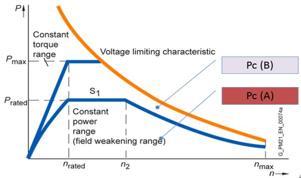 我们将以主轴电机的特性曲线图(这里以西门子公司生产的SIMOTICS M-1PH8为例),结合之前计算的出的转速n和Pc,可以对应在下图上中标出相应的坐标(n,Pc)的位置,。如果坐标位置(n,Pc)所在位置如Pc(A)所示,则代表主轴电机处在连续工作周期内(S1曲线内)内,可以保证加工过程的可以稳定可靠进行。但如果坐标所在位置如Pc(B)所示,处在间歇工作区间,则表示加工工艺参数给定设置的的不合适,需要重新调整。