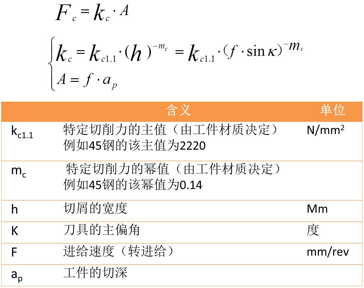 我们得到了对于车床加工,完成单位体积材料切削所需切削力的公式: