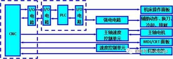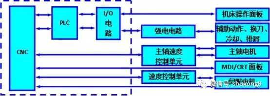 (3)内装型PLC可与CNC共用CPU,也可单独使用一个CPU;内装型PLC一般单独制成一块附加板,插装到CNC主机中。不单独配备I/O接口,而是使用CNC系统本身的I/O接口;PLC控制部分及部分I/O电路所用电源由CNC装置提供,不另备电源。