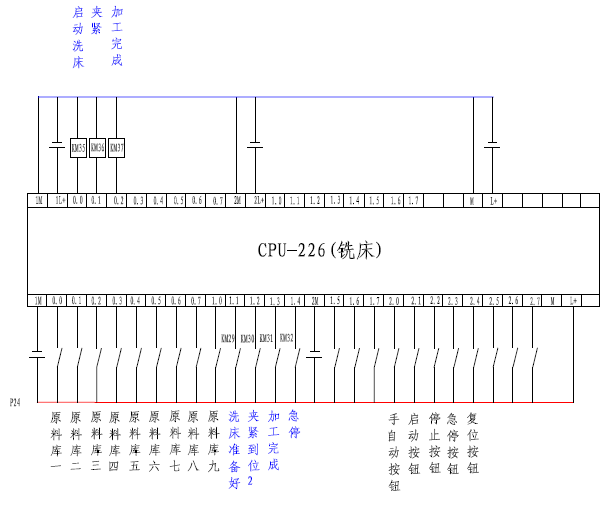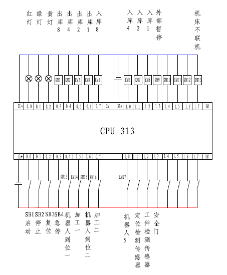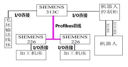 上图PLC采用西门子品牌,S7-300作为上位机,S7-200与机床通过I/O信号相连;S7-300与S7-200使用Profibus总线相连;S7-300与工业机器人使用I/O信号相连;工业机器人主体和控制器之间使用自带通讯电缆(直接接插)连接。