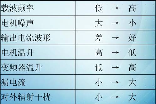 当载波频率低时,来自电机的载波噪音虽然会增大,但是泄漏到大地的电流会减小,此时电机损耗增加,电机温升增加,但变频器本身的温升会减小。当载波频率高时,虽然电机噪声会减小,电机损耗降低,电机温升减小,但变频器损耗增加,变频器温升增加,干扰增加。