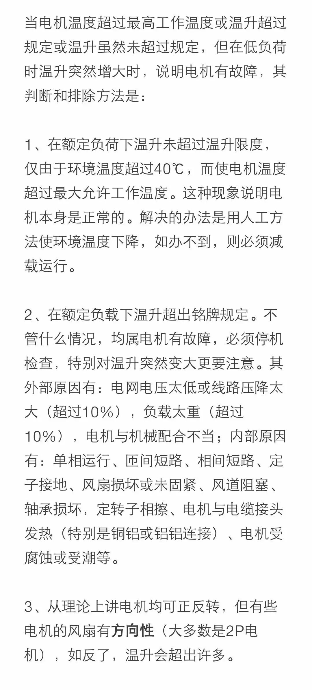 在电机运行过程中,如温升突然增大,说明电机有故障,或风道阻塞,或负荷太重,或绕组烧毁等。