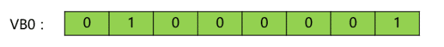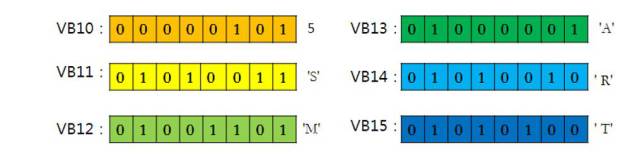(8)ASCII:数据类型字符或ASCAII。一个ASCAII需要8位二进制数存储器,一个汉字需要占用2个字节的存储器空间,寻址方式为字节选择,如:字符‘A’。存储到VB0中,则VB0的值存储内容为: