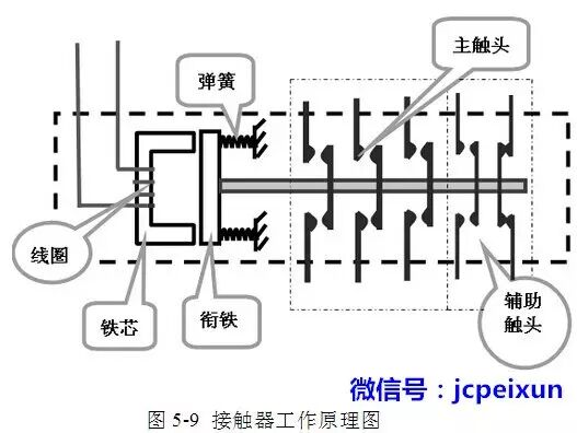 接触器是一种自动开关,是电力拖动中主要的控制电器之一,它分为直流和交流两类。其中,交流接触器常用来接通和断开电动机或其他设备的主电路。图5-9是交流接触器的主要结构图。接触器主要由电磁铁和触头两部分组成。它是利用电磁铁的吸引力而动作的。当电磁线圈通电后,吸引山字形动铁心 (上铁心),而使常开触头闭合。
