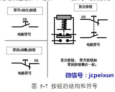 2).按钮 按钮常用于接通、断开控制电路,它的结构和电路符号见图5-7。