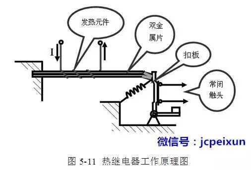 热继电器是用来保护电动机,使之免受长期过载危害的继电器。热继电器是利用电流的热效应而动作的,它的工作原理如图5-11所示。图中热元件是一段电阻不大的电阻丝,接在电动机的主电路中的双金属片,由两种具有不同线膨胀系数的金属采用热和压力辗压而成,亦可采用冷结合,其中,下层金属的膨胀系数大,上层的小。当主电路中电流超过容许值,双金属片受热向上弯曲致使脱扣,扣板在弹簧的拉力下将常闭触头断开。触头是接在电动机的控制电路中的,控制电路断开使接触器的线圈断电,从而断开电动机的主电路。
