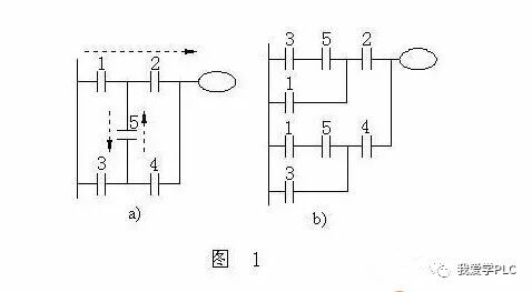 如图1所示触点1、2接通时,有一个假想的“概念电流”或“能流”(Power Flow)从左向右流动,这一方向与执行用户程序时的逻辑运算的顺序是一致的。能流只能从左向右流动。利用能流这一概念,可以帮助我们更好地理解和分析梯形图。图1a中可能有两个方向的能流流过触点5(经过触点1、5、4或经过触点3、5、2),这不符合能流只能从左向右流动的原则,因此应改为如图1b所示的梯形图。