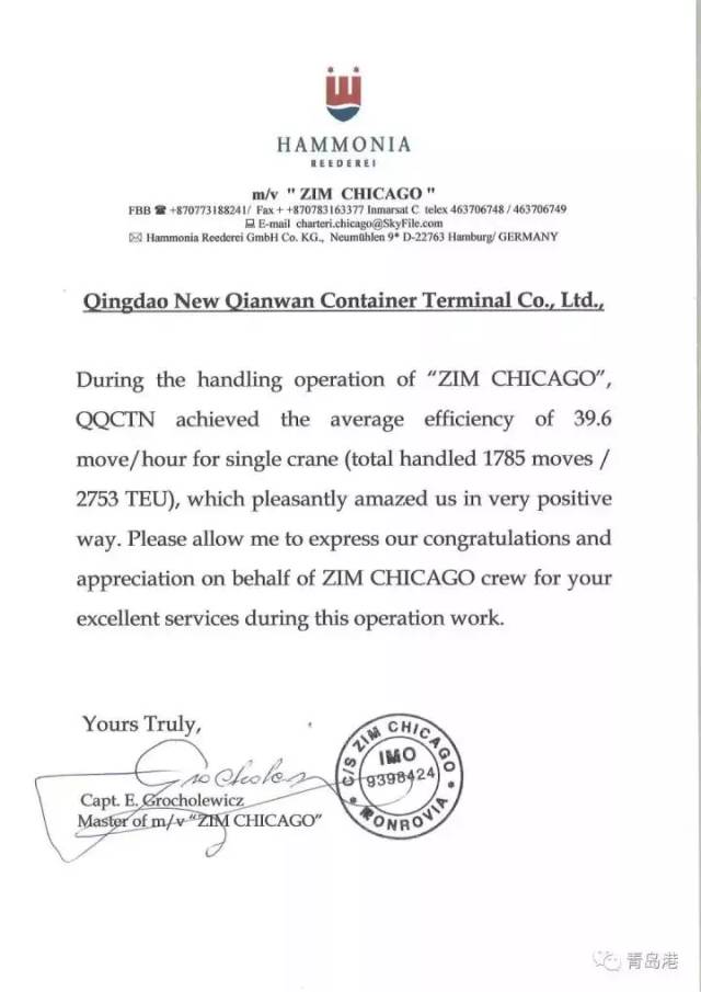 2017年12月3日,青岛港自动化码头迎来“以星芝加哥”轮,在码头上演一场精彩的“人机大战”。 当日的作业从零点20分开始,到上午9:25分结束。在1785个自然箱装卸作业中,振华重工提供的自动化码头设备与装卸系统,单机平均作业效率达到39.6move/h,创出全球自动化码头单机平均作业效率最高纪录,比全球自动化码头单机平均效率高出50%。 12月3日,青岛港全自动化码头迎来“以星芝加哥”轮。 此次青岛自动化码头的“人机大战”首战告捷,“以星芝加哥”轮船长格罗索莱维奇将写有“青岛港单机平均效率39.6move/h”的确认书郑重交给码头总经理张连钢手中,他激动的说:“青岛港创造了集装箱码头行业的世界奇迹,让全世界为中国感到骄傲!” 2017年5月11日,青岛港全自动化码头正式投产,标志着世界最先进、亚洲首个真正意义上的全自动化集装箱码头投入运营。在该项目中,振华重工创下同类自动化码头项目投产的世界双项纪录:仅21.5个月实现商业船作业;岸桥平均效率达到25.6自然箱/小时(Move/H)。 该项目是振华重工在国内承建的第二个自动化码头装卸系统总承包项目,在软件方面,提供了码头设备控制系统(ECS),包括自动化岸边装卸系统、水平运输系统、自动化堆场系统及其配套设施等;在硬件方面,制造了7台远程操控双小车岸桥、38台全锂电池带顶升功能的自动化导引小车(L-AGV)、38台自动化轨道吊及1台调箱门固定吊。 ▲效率确认函▲ ECS装卸系统 在作业现场,设备的每一个动作,都通过振华重工自主研发的码头设备控制系统(ECS)系统来完成。该系统相当于自动化码头设备的“大脑”,控制着码头上所有的自动化设备。此前,振华重工已于2015年在厦门远海自动化码头上首次使用自主研发的这套系统,经过近几年的优化改进,并结合青岛港的实际布置情况,研发优化出目前的系统版本,能够比肩世界上最先进的自动化码头设备控制系统。 AGV自动导引运输车 振华重工为该项目制造了7台远程操控双小车岸桥、38台全锂电池带顶升功能的自动化导引小车(L-AGV)、38台自动化轨道吊及1台调箱门固定吊。 AGV即码头自动化引导小车,又名无人搬运车,是自动化码头装卸系统的重要组成部分,其显著特点是无人驾驶,通过码头中央控制室的远程控制,能够沿预定的路线自动行驶,将货物或物料自动从起始点运送到目的地,实现货物和物料装卸与搬运全过程自动化。 在青岛港自动化码头,振华重工为其AGV小车新增了顶升功能。以往,小车将集装箱送往堆场区,等待轨道吊将集装箱吊起后离开,如今带顶升功能的小车可自行提升集装箱,放在堆场区的架子上待轨道吊吊起,节约了小车等待时间。 同时,该批小车采用全锂电池供电,并用机会充电方式给电池补电,绿色环保实现设备的无限循环作业,采用软件和激光方式,为小车新增三重防撞功能,避免小车投入数量较多时,出现碰撞事故。 1993年,世界上第一个自动化码头——荷兰ECT自动化码头建成,目前,经过30年的发展,全球自动化码头的单机平均作业效率在每小时20个自然箱左右,传统人工码头的单机平均作业效率为25-28个自然箱,全自动化码头也因为建设难度大、成本高、收益慢被称为“贵族码头”。 此前,振华重工总裁、党委副书记黄庆丰曾表示,自动化码头的装卸效率定将在不久的将来赶超人工。 最终,青岛港经过近7个月的商业运营,成功完成了超越,单机作业效率已达到39.6move/h。目前,青岛港共运营14条航线,实现周班轮转。作业船舶270多艘,吞吐量突破35万TEU,船舶准班率保持100%。 我们骄傲! 在自动化码头的制造研发上, 中国标注下新的印记! 我们感谢、致敬! 那些奋斗不止的大国工匠!