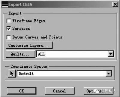 (3) 在Export IGES对话框中进行相应参数设置,默认项“Surfaces”是将Pro/ENGINEER的3D模型输出为曲面数据;“Wireframe Edges”项仅输出3D模型的边界线;“Datum Curves and Points”项仅输出3D模型上的点和曲线资料。利用“Quilts”按钮选择3D模型上的曲面,可以仅输出含有该曲面的IGES数据。在完成相应参数设置后,单击“Ok”,文件转换完毕。
