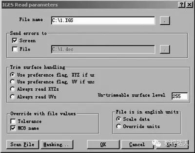 值得注意的是,当在NT平台上将IGES文件转换到UG软件中时,有时会发生错误,错误的原因有很多,而IGES文件格式不对是最经常发生的错误原因,可用NOTEPAD 打开IGES 文件来进行判定。产生这种错误最根本的原因是该IGES文件是UNIX文件格式,与MS-DOS文本文件格式有差异。所以必须首先将UNIX格式的IGES文件转换成MS-DOS文本文件格式,然后再导入UG软件。转换方法有以下三种: 其一是在UNIX环境下, 利用UNIX相应的命令,将UNIX格式的IGES文件转换成MS-DOS文本文件格式;其二是在WINDOWS2000环境下,利用Write命令打开IGES文件,将其另存为MS-DOS文本文件格式;最后一种方法是在WINDOWS NT4.0环境下,利用ULTRAEDIT打开IGES文件,将其另存为MS-DOS文本文件格式。