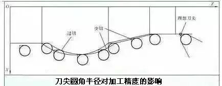 2) 车削锥面和圆弧面当加工锥面和圆弧面时,即加工轨迹与机床轴线不平行时,实际切削点与理想刀尖点之间在X、Z坐标方向都存在位置偏差,刀尖圆弧半径对加工精度的影响如下图所示。如果以理想刀尖点编程,会出现少切或过切现象,造成加工误差。刀尖圆弧半径越大,加工误差就越大。