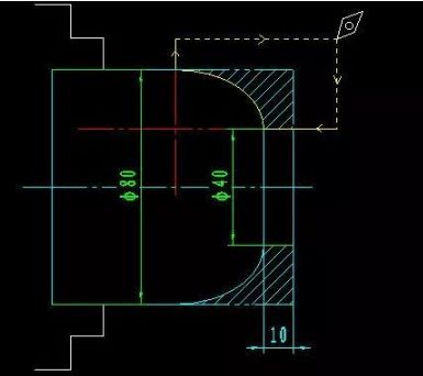 图中椭圆长半轴30mm,短半轴20mm,椭圆中心位置如图所示,不在轴线上,因此在计算编程所用的坐标值时,X方向要再加上40,Z方向要减去30+10=30