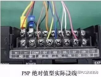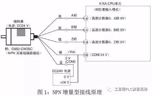 (2)下图为PNP 输出增量型E6B2-CWZ6B 的实际接线图,棕色线接电源正极,蓝色线接电源负极,黑色线接输入0.00,白色线接输入0.01,橙色线接输入0.04,PLC 的COM 接电源负极。