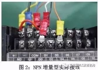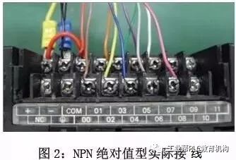 (1)正确接线至关重要,如图1 为NPN 输出增量型E6B2-CWZ6C 的接线原理,图2 为NPN 输出增量型E6B2-CWZ6C 的实际接线,棕色线接电源正极,蓝色线接电源负极,黑色线接输入0.00,白色线接输入0.01,橙色线接输入0.04,PLC 的COM 接电源正极。