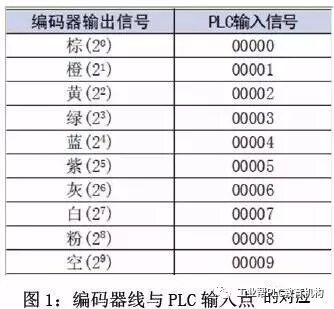 (3)图1 为绝对值型编码器的线与PLC 输入的点的对应图,图2 为NPN 输出绝对值型E6C3-AG5C 的实际接线图,红色线接电源正极,黑色线接电源负极,褐色线接输入0.00,橙色线接输入0.01,黄色线接输入0.02,绿色线接输入0.03,蓝色线接输入0.04,紫色线接输入0.05,灰色线接输入0.06,白色线接输入0.07,粉色线接输入0.08,PLC 的COM 接电源正极。