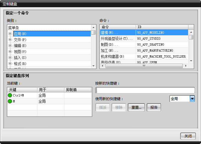2. 然后点“键盘”,得到以下界面,此时即可设置快捷键;若要查看已存在的快捷键,则点击右下角“报告”按钮即可。