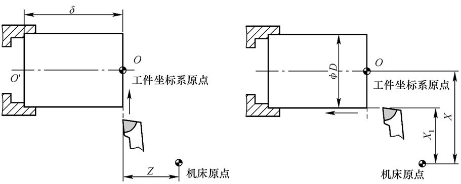 2)手动操作加工外圆,记录下刀位点的X向机械坐标值,停机测量工件直径,计算出主轴中心的机械坐标值。