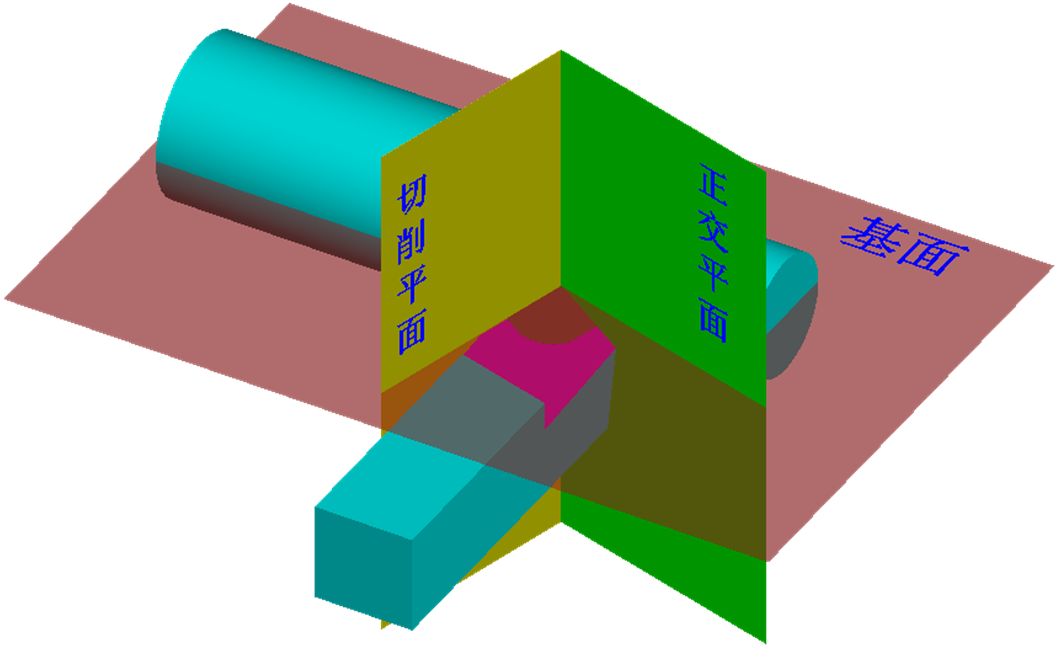 为了确定和测量车刀的几何角度,需要选取三个辅助平面作为基准,这三个辅助平面是切削平面、基面和正交平面。