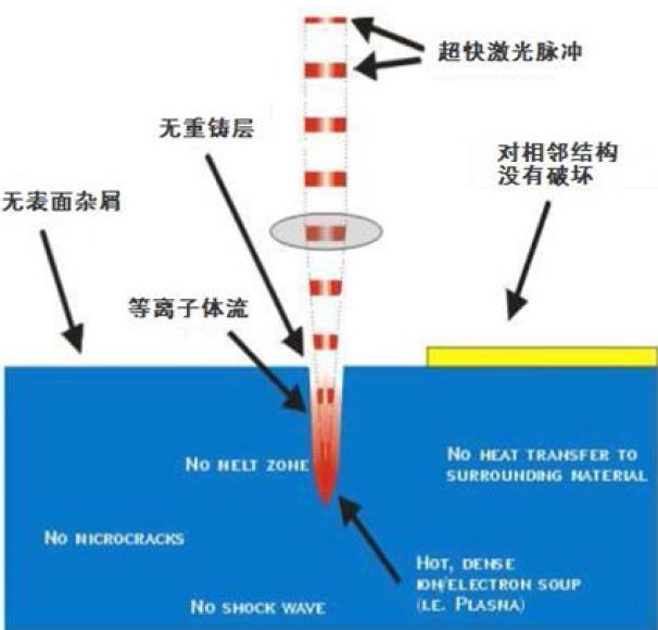 超短脉冲加工能量极快地注入很小的作用区域,瞬间高能量密度沉积使电子吸收和运动方式发生变化,避免了激光线性吸收、能量转移和扩散等影响,从根本上改变了激光与物质相互作用机制。