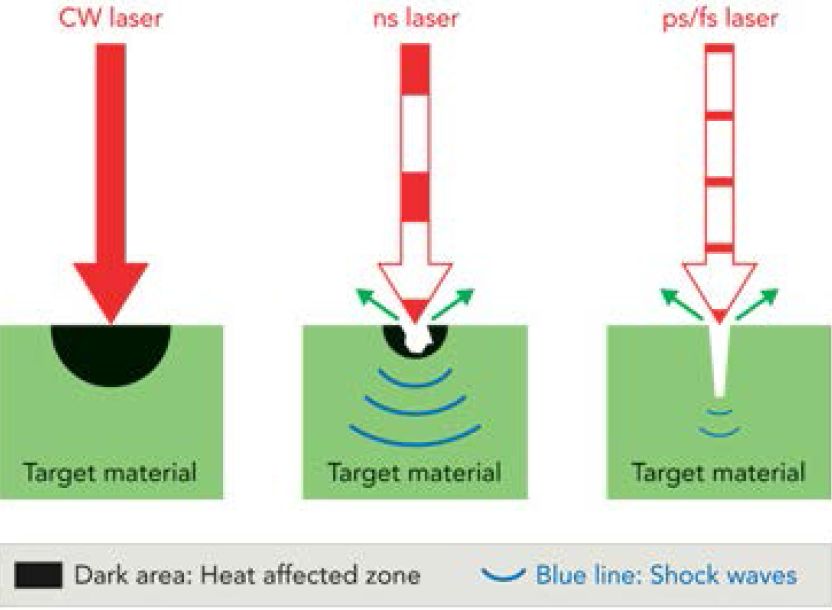 当激光以皮秒量级的脉冲时间作用到材料上时,加工效果会发生显著变化。随着脉冲能量急剧上升,高功率密度足以剥离外层电子。由于激光与材料相互作用的时间很短,离子在将能量传递到周围材料之前就已经从材料表面被烧蚀掉了,不会给周围的材料带来热影响,因此也被称为“冷加工”。凭借冷加工带来的优势,短与超短脉冲激光器进入到工业生产应用当中。