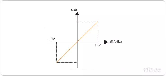 如果伺服驱动器对输入指令不设置阈值(电压死区),理想情况下,+10V对应电机正转的额定速度,-10V则对应电机反转的额定速度,指令电压幅值的变化,电机转速也随之线性变化,如图2所示。