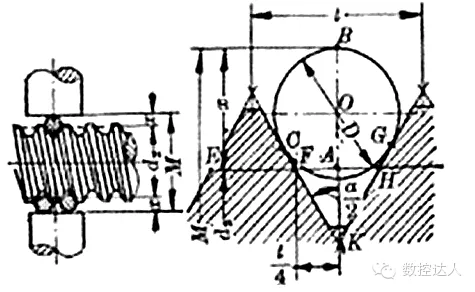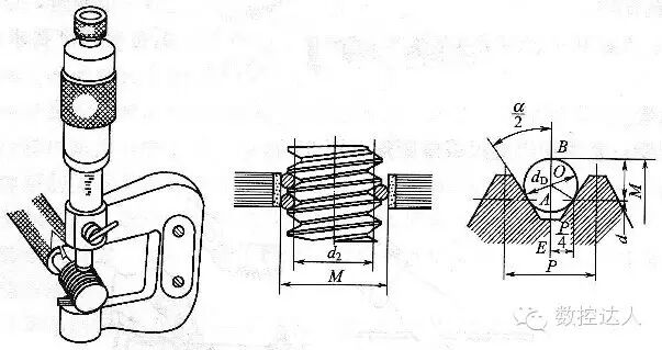 M:千分尺测量的数值(mm)、D:量针直径(mm)、α/2:牙形半角、t:工件螺距或蜗杆周节(mm)