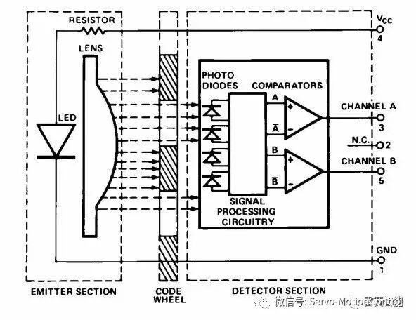光电码盘安装在电机轴上,其上有环形通、暗的刻线。通过LED发射光源,多组光耦器件矩阵排列提升信号稳定性,并通过接受光源的强弱,内部进行比较输出A、B两路信号。A、B信号相差90度相位差。另外每转输出一个Z相脉冲以代表零位参考位。