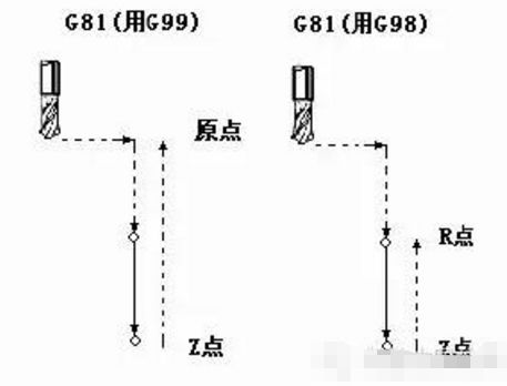 X,Y为孔的位置、Z为孔的深度,F为进给速度(mm/min),R为参考平面的高度。G△△可以是G98和G99,G98和G99两个模态指令控制孔加工循环结束后刀具是返回初始平面还是参考平面;G98返回初始平面,为缺省方式;G99返回参考平面。编程时可以采用绝对坐标G90和相对坐标G91编程,建议尽量采用绝对坐标编程。