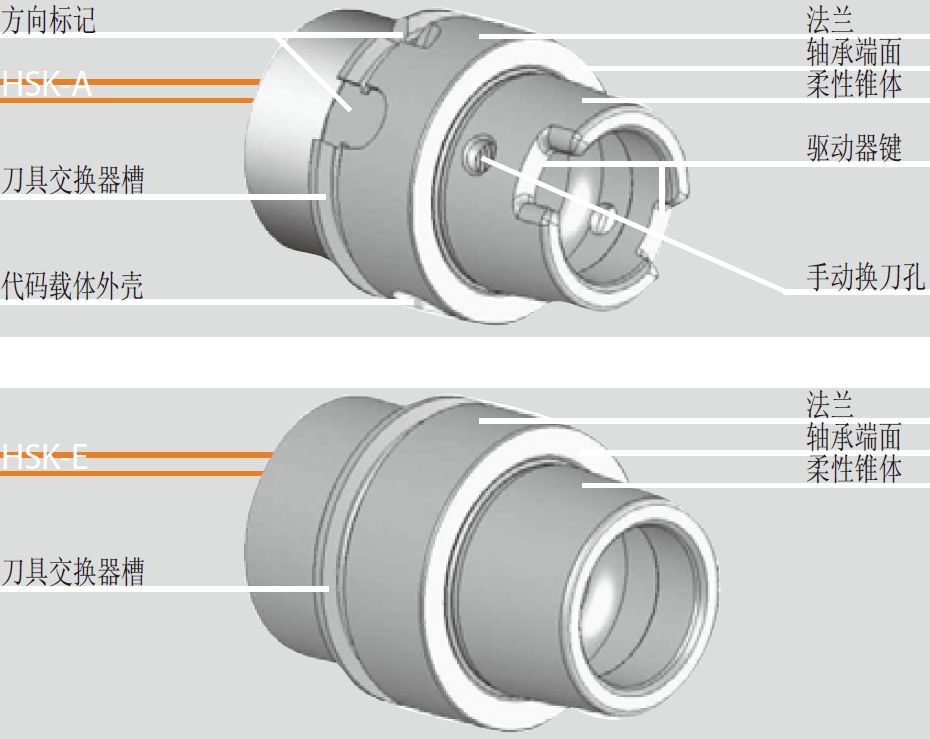 由于在 HSM 加工中需要很高的主轴速度,因此,最好使用HSK-A 和 HSK-E 刀座系统。由于刀座法兰安装在主轴头上,刀座在 Z 方向上有明确的机械支撑,因此,在较高转速下,不会因离心力增大而拖进主轴。