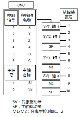使用FSSB 的系统,通过光缆连接CNC、伺服放大器、主轴放大器以及分离式检测器接口单元。这些放大器和分离式检测器接口单元叫做从控装置。2 轴放大器由2 个从控装置组成,3 轴放大器则由3 个从控装置组成。从控装置上,按照离CNC 由近到远的顺序对FSSB赋予1,2,…10 的编号(从控装置号)。