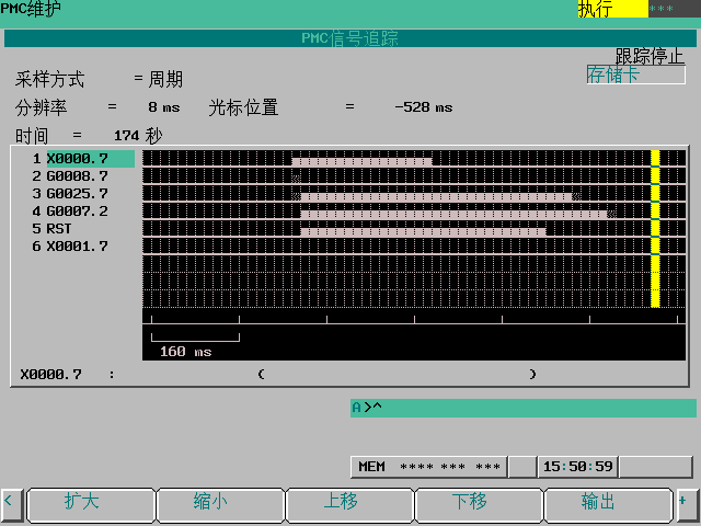 此处应注意的是,PMC中应对G25.7信号做延时处理。该延时的作用是将外部工件号检索功能启动信号G25.7滞后于复位状态中信号F1.1触发。如果没有延时触发,复位中断刚性攻丝循环后,将无法检索刚性攻丝回退程序号,无法执行回退动作。原因如下图信号跟踪所示。
