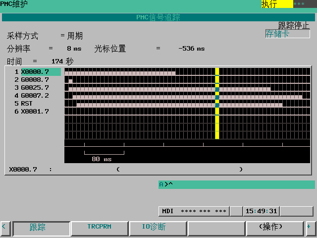 如上图所示可以看出,如果没有延时触发外部工件号检索启动信号G25.7,该信号下降沿有效,在该信号下降沿时,复位状态信号F1.1仍然处于有效状态,此时外部工件号检索功能也即无效。延时触发后,观察信号跟踪画面如下图所示。