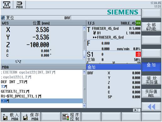 DRF又称手轮偏置,在自动或者MDA方式下运行程序加工的时,利用手轮产生增量式零点偏移。激活DRF功能,手轮移动时,工件坐标系不发生改变,只是机械坐标系按照手轮移动量变化。DRF 偏移不显示在轴的实际值显示区中。(以下以828D系统为例介绍)
