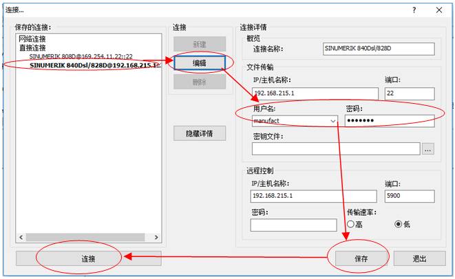3)软件连接设置:打开软件后,弹出连接设置对话框,可用【连接】下拉框——选择【连接…】,软件已自动添加840Dsl/828D的连接。选择【编辑】,用户名选择“manufact”,密码为“SUNRISE”(大写),设置完成后点击【保存】,再点击连接即可在PC端显示数控系统的画面。如图6所示。