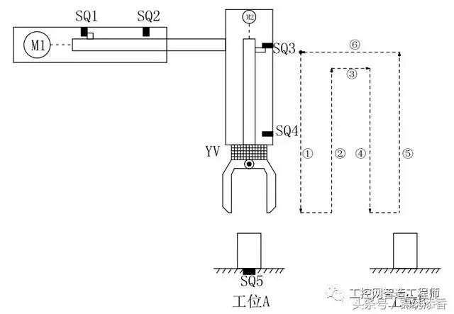 简易机械手结构图如图所示,M1为控制机械手左右移动的电动机,M2为控制机械手上下升降的电动机,YV线圈用来控制机械手夹紧防松,SQ1为左到位检测开关,SQ2为右到位检测开关,SQ3为上到位检测开关,SQ4为下到位检测开关 ,SQ5为工件检测开关。